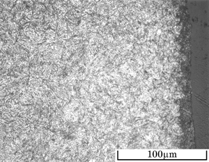 | 表面近傍は若干の残留オーステナイトを含む焼戻オーステナイト。 表面には粒界酸化が認められる。 | ||