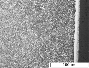 | 素地はソルバイト。表面の白層は窒化物(化合物層)。 その下層は窒素拡散層。 | ||