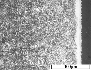 素地はソルバイト。表面の白層は窒化物(化合物層)。